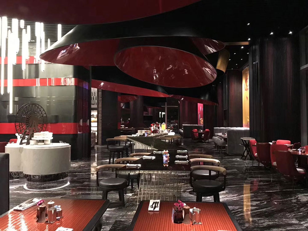 The stainless steel horn smallpox modelling of full-time dining-room and irregular ribbon smallpox modelling use wood grain color and bright red photograph union, elegant and elegant, bright-coloured colour can stimulate the taste bud of guest especially, look more delicate and edible.